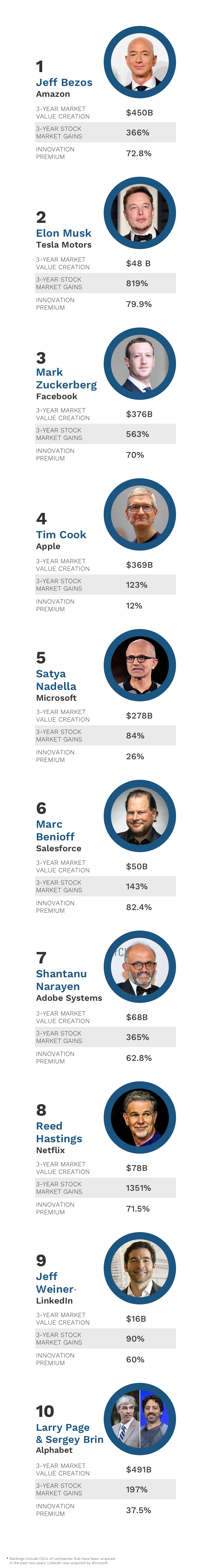 What sets apart the superstars of innovation? Not just creativity and genius ideas. Nikola Tesla may have been more brilliant than Thomas Edison, but Edison had huge successes that changed the world, and Tesla died penniless. What Edison had that Tesla didn't is what professors Jeff Dyer of Brigham Young University and Nathan Furr of INSEAD business school call innovation capital. It's a combination of strengths from skill at leading innovation to powerful connections with other leaders and, perhaps most important, an ever-growing record of making big new things happen. Dyer and Furr have ranked the leaders with the greatest innovation capital today by measuring four essential qualities: reputation for innovation (looking at media coverage over five years), social connections and networks (on Twitter and LinkedIn), track record for value creation (based on the market value growth of their companies) and investor expectations for future value creation (measured by the premium investors put on their companies' stock). Here are the 10 top finishers; Forbes will publish a full list of the 100 most innovative leaders in 2019.