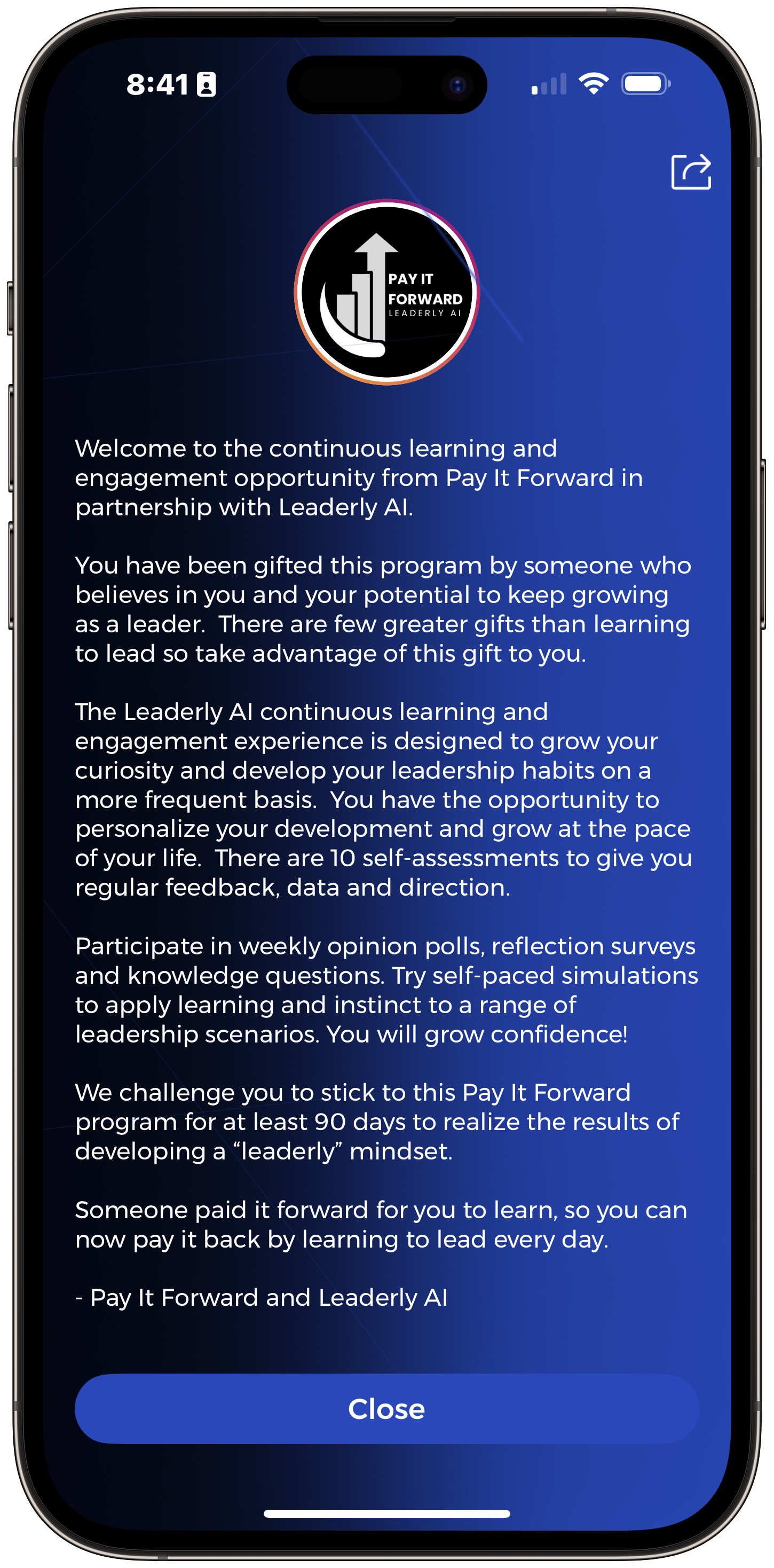 The Pay It Forward program is for you to gift a special edition experience for emerging leaders who often don’t get the benefit of leader development and personal reflection technology. This is your chance to give the greatest gift to a person: the belief and tools to learn to lead.